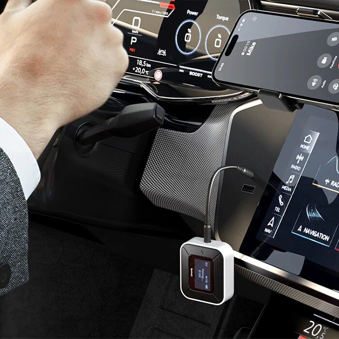 In receive mode, the transmitter receives audio from your phone or tablet on your wired speakers or car stereo.